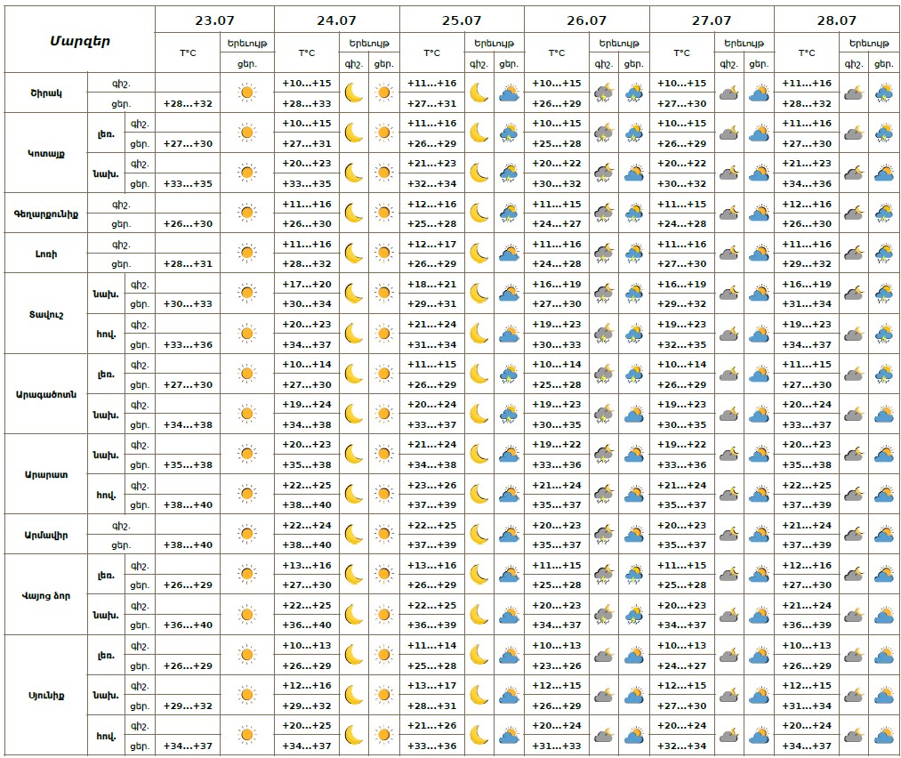 Հանրապետության տարածքում հուլիսի 23-ի ցերեկը, 24-ին, 27-ին սպասվում է առանց տեղումների եղանակ։ Հուլիսի 25-ին և 28-ին կեսօրից հետո, 26-ին գիշերը և կեսօրից հետո առանձին շրջաններում սպասվում է կարճատև անձրև և ամպրոպ, հնարավոր է նաև կարկուտ։
