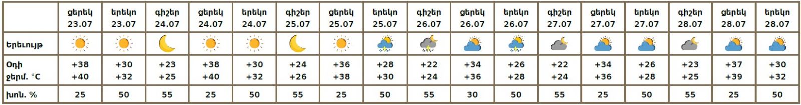 Հարավից արևադարձային տաք օդի ալիքի ներթափանցմամբ պայմանավորված՝ հուլիսի 23-24-ին Արարատյան դաշտում, Սյունիքի հովիտային գոտում և Երևանում սպասվում է բարձր ջերմային ֆոն․ ցերեկը ժամը 16։00-17-00- ն ընկած ժամանակահատվածում՝ +38․․․+40 աստիճան տաքություն։ Նշված հատվածներում ինչպես նաև Արագածոտնի, Կոտայքի և Վայոց ձորի նախալեռներում առաջիկա 5 օրերին սպասվում է նաև բարձր կարգի հրդեհավտանգ իրավիճակ։