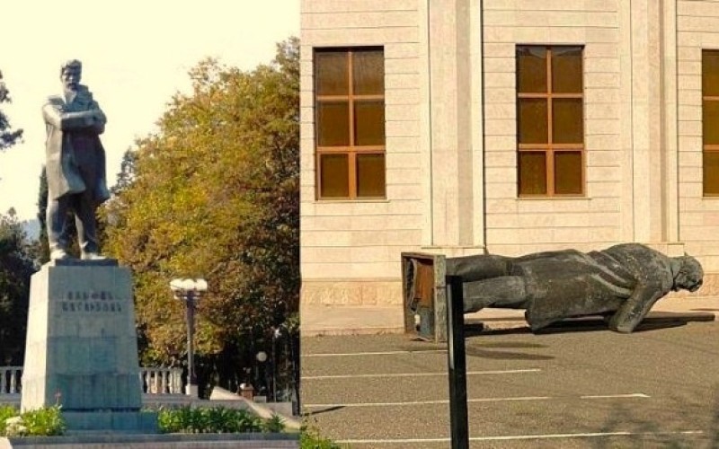 Լուսանկարում Ստեփանակերտի առաջին տապալված արձանն է՝ Ստեփան Շահումյան, որի անունով ավելի քան հարյուր տարի առաջ անվանակոչվել է Արցախի Հանրապետության մայրաքաղաքը»:
