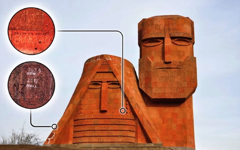 Նրա ներկայացրած տեսանյութում արձանի վրա՝ առջևի հատվածում, երևում են ադրբեջաներենով արված տարբեր գրառումներ։