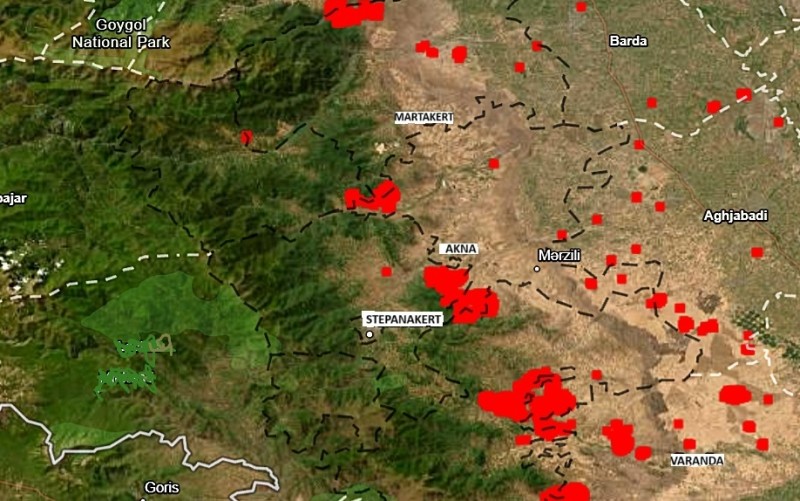 Լուսանկարում ներկայացված է հրդեհների տարածման քարտեզը՝ ըստ NASA LANCE/FIRMS համակարգի տվյալների։
