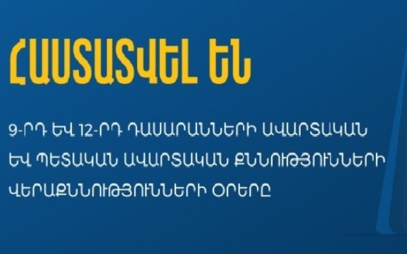 Գնահատման և թեստավորման կենտրոնը (ԳԹԿ) հաստատել է 9-րդ և 12-րդ դասարանների ավարտական և պետական ավարտական քննությունների վերաքննությունների օրերը։