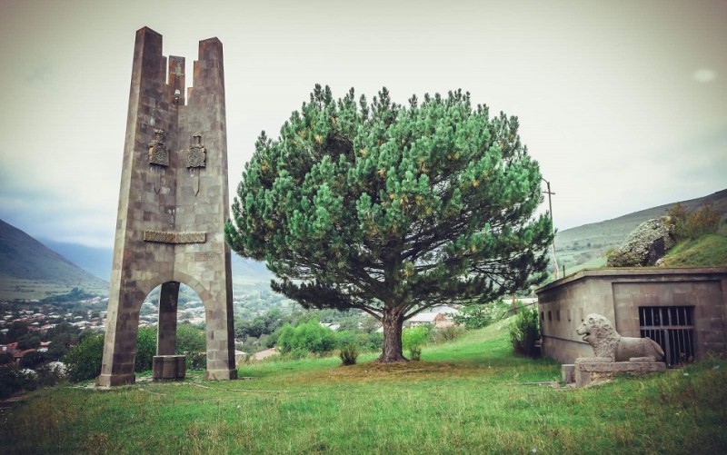 > Պղնձաքար լեռանը թիկնած ժայռաբեկորից վեր է խոյանում երեք պատերազմների (Սարդարապատ, Ֆիննական, Մեծ Հայրենական) հաղթանակները խորհրդանշող եռաթև և եռագագաթ քանդակազարդ հուշասյուն: