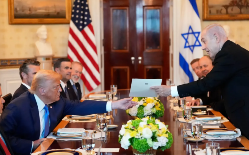 Ինչպես հաղորդում է CNN-ը, Նեթանյահուն Թրամփին է ներկայացրել Խաղաղության Նոբելյան մրցանակի հանձնաժողովին ներկայացված իր նամակը՝ իր հիացմունքը հայտնելով նախագահի՝ «խաղաղության և անվտանգության ձգտման» համար։ «Մինչ մենք խոսում ենք, նա երկիրը երկրի, տարածաշրջանը տարածաշրջանի հետևից խաղաղություն է տարածում։ Ուստի ես ցանկանում եմ ներկայացնել Ձեզ, պարոն նախագահ, նամակը, որն ուղարկել եմ Նոբելյան մրցանակի հանձնաժողով։ Այստեղ ես առաջադրում եմ Ձեր թեկնածությունը, ինչին արժանի եք։ Դուք պետք է ստանաք այն»,- ասել է Նեթանյահուն։