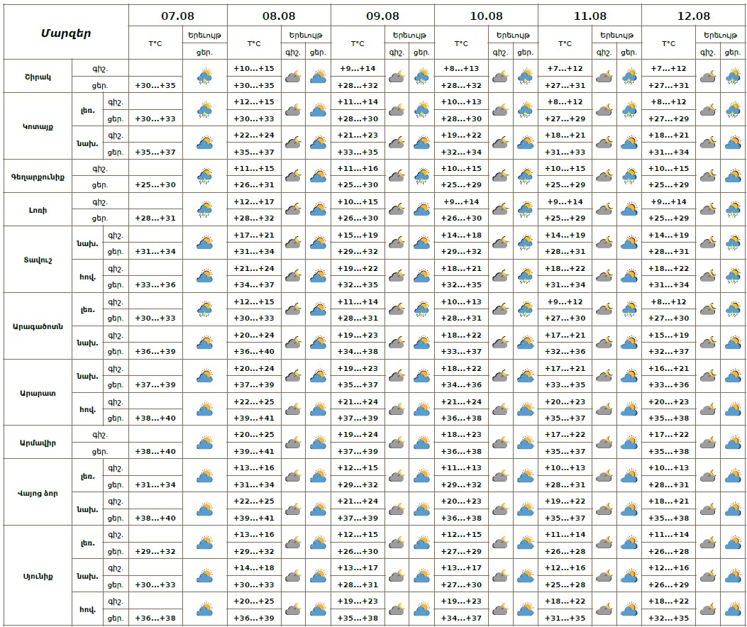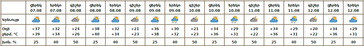 Օգոստոսի 7-ի ցերեկը, 9-12-ին առանձին շրջաններում սպասվում է կարճատև անձրև և ամպրոպ: Օգոստոսի 8-ին սպասվում է առանց տեղումների եղանակ։
