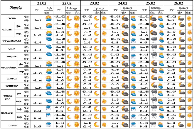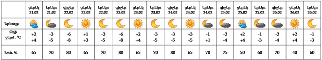 Հանրապետության տարածքում փետրվարի 21-ի ցերեկը` Սյունիքում և Արցախում, 24-ի ցերեկը, 25-ի գիշերը` առանձին շրջաններում սպասվում է ձյուն։ Փետրվարի 22-24-ին, 25-ի ցերեկը, 26-ին սպասվում է առանց տեղումների եղանակ: