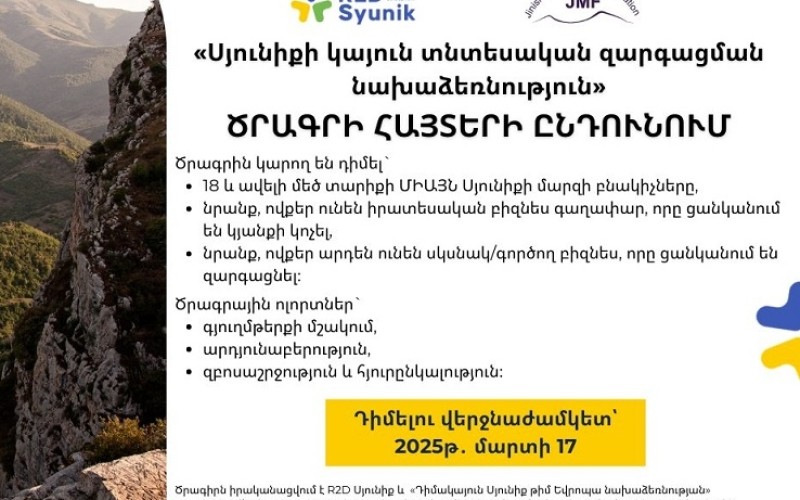 Սյունիքի մարզում տնտեսական հնարավորությունները ընդլայնելու նպատակով «Ջինիշյան» հիշատակի Հիմնադրամը հայտարարում է դիմում – հայտերի ընդունում՝ «Սյունիքի կայուն տնտեսական զարգացման նախաձեռնություն» ծրագրի շրջանակներում։