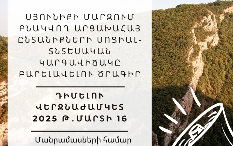 «Ջինիշյան» հիշատակի Հիմնադրամը (ՋՀՀ)՝ «Գալուստ Կիւլպէնկեան Հիմնարկութիան» և Սուրբ Սարգիս բարեգործական կազմակերպոըթյան հետ համագործակցությամբ՝ ՀՀ Սյունիքի մարզում հայտարարում է «Արցախից բռնի տեղահանված հայ ընտանիքների տնտեսական բարեկեցության և կենսունակության բարելավում» ծրագրի հայտերի ընդունում։
