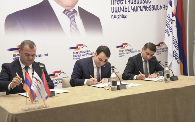 Մարտի 31-ին «Ուժեղ Հայաստան» կուսակցության քաղաքական խորհրդի անդամ Նարեկ Կարապետյանը դաշինքի ձևավորման մասին համաձայնագիր է ստորագրել «Նոր դարաշրջան» կուսակցության նախագահ Հարություն Հարությունյանի և «Միավորված հայեր» կուսակցության պատվավոր նախագահ, լիազոր ներկայացուցիչ Նաիրի Սարգսյանի հետ։
